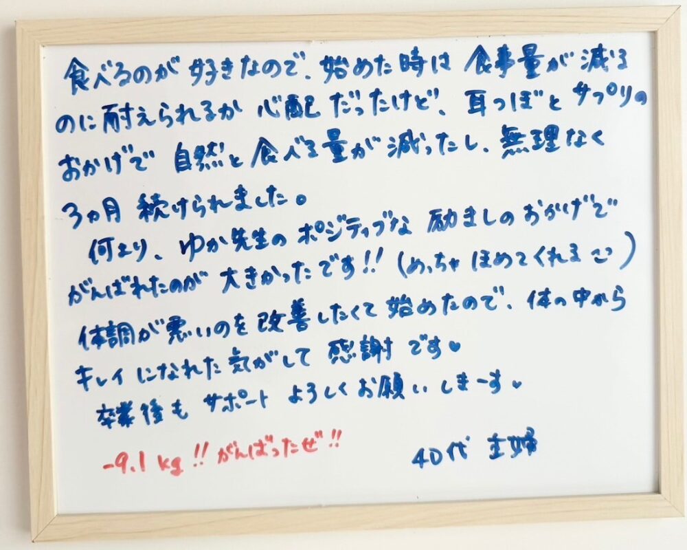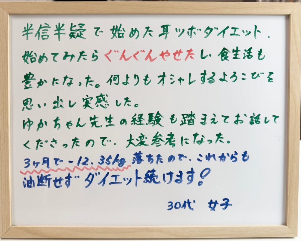に投稿されました YUKIKO .HTrustindex は、レビューの元のソースが Google であることを確認します。 耳つぼについての分かりやすい説明、 丁寧な施術に大満足です! 私は耳つぼと、不調部位に 耳つぼジュエリーをお願いしました。 ジュエリーは持ち込み可とのことです。 (詳細気になる方はお問い合わせください) ゆかさんはダイエットのスペシャリスト。 ダイエットでお悩みの方にも 是非足を運んでもらいたいです♪♪に投稿されました Ayaka Fuse (あや)Trustindex は、レビューの元のソースが Google であることを確認します。 私の生活習慣や職業などを考慮して頂きながら無理なく、でも結果が出るように一緒に考えてくださいます。 なかなか体重が思うように減らない時でも、褒めたり、励ましたりしてくださるので、目標に向かって頑張り続けることができています! リバウンドをして、もう体重を落とすことは無理だと思っていた私が、今のところ10kg近く落とすことが出来ました!まだまだ目標には届いていませんが、最後までがんばり続けたいです! 勇気を出して、一歩を踏み出して良かったと思えます。に投稿されました 戸村優子Trustindex は、レビューの元のソースが Google であることを確認します。 以前通っていたところは食べるものも決まっており、断食もあり辛くリバウンドもしてしまいました。ゆかさんは食べられるものも多く、摂取した物のアドバイスや組み合わせなど丁寧に教えてくれました。 目標まではまだまだですが、先生とならクリア出来そうです。に投稿されました 鈴木由佳里Trustindex は、レビューの元のソースが Google であることを確認します。 耳ツボダイエットは2回目です。 以前通っていたところは断食が辛かったのでこちらを選びました。 3食ちゃんと食べながら痩せることができました✨お気に入りの服も着られるようになり、健康診断でも内科の医師に褒められました✨✨ 目標達成までもう少しよろしくお願いします(笑)に投稿されました one.Trustindex は、レビューの元のソースが Google であることを確認します。 人見知りで最初とても緊張しましたが、先生がとても優しくて通うたびに癒されながら、ダイエットを続けることができました!ダイエットに対する意識がとても変わりました。3ヶ月で-11kgも痩せることができて、家族も綺麗に痩せれたねと共に喜んでくれています☆勇気を出して、本当に良かったです!ありがとうございます!に投稿されました ちょぼちょぼTrustindex は、レビューの元のソースが Google であることを確認します。 ゆか先生に出逢えて私の人生変わりました。 ちょっとずつ頑張って行こうと思います( ´-` ) 目指せ!皆で美しい体✨ ここはオススメです。に投稿されました ゆみTrustindex は、レビューの元のソースが Google であることを確認します。 体に良い物をとって、きれいに痩せられました!身体が軽くなって嬉しいです! 気持ちも前向きになりました!ありがとう♡に投稿されました まゆゆTrustindex は、レビューの元のソースが Google であることを確認します。 毎回とても親身になって話を聞いてくれました! 何をやってもいつもリバウンドしてた私が、目標だった8kg痩せてからも維持できているのには驚きです♬ ダイエット卒業後も、先生が無料で検診サポートしてくれるからこれからも安心です!! 自宅サロンなのも、人目を気にせず通えて良かったです。 ダイエットに悩んでいる人は一度相談に行ってみて損はないですよ!に投稿されました なぁTrustindex は、レビューの元のソースが Google であることを確認します。 先生が自分の経験をもとにお話ししてくださるので、食事の取り方、調理方法など非常にためになります。 痩せたことにより、イビキをかきづらくもなり睡眠の質も上がった気がします☺ また、通いはじめて2ヶ月経ち、不順で1年も来てなかった生理が来るようになりました。 ゆか先生に感謝です。