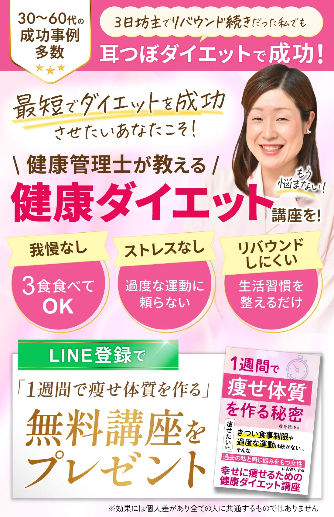 私はダイエットでエステやジム・自己流の宅トレなど、これまでいろんな方法を試し、総額200万円以上使ってもリバウンドを繰り返していました。そんな時、耳つぼダイエットに出会い、8ヶ月で-23㎏痩せることができました。